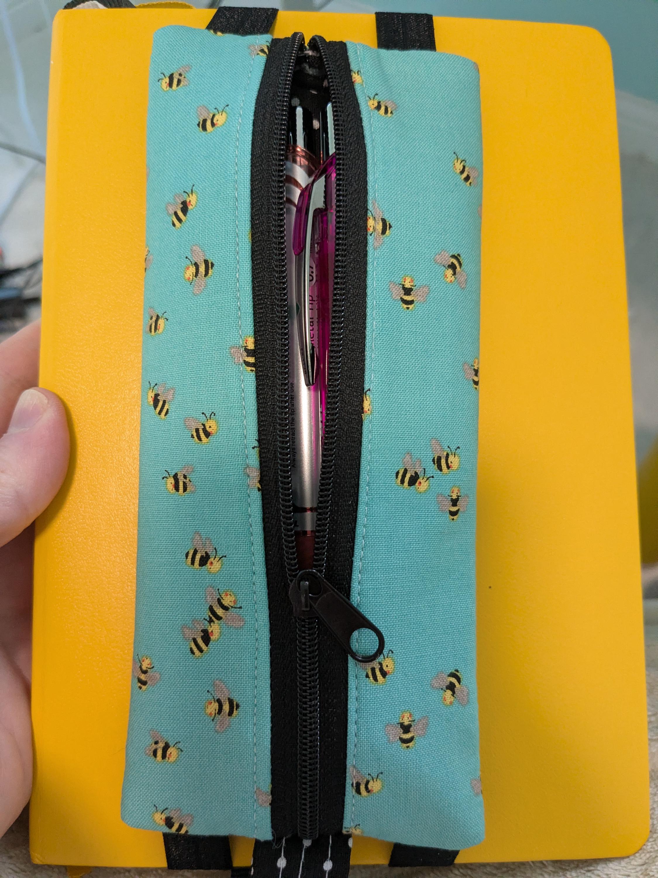 This pencil pouch is fully lined with a cute cotton lining with a quilted lining sandwiched between to help hold it shape. This gives the pouch durability and structure. And, it protects pencil points from breaking through.