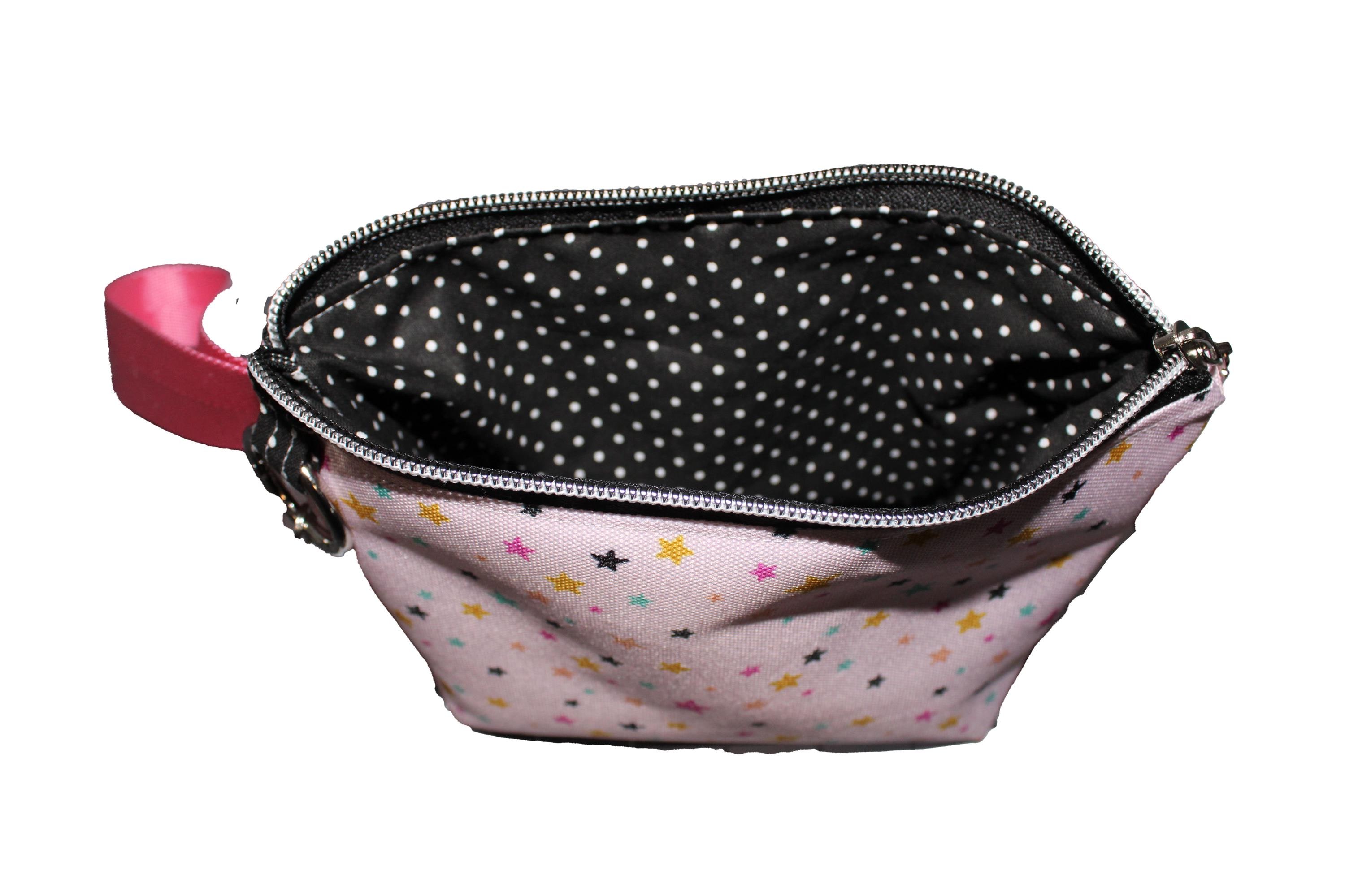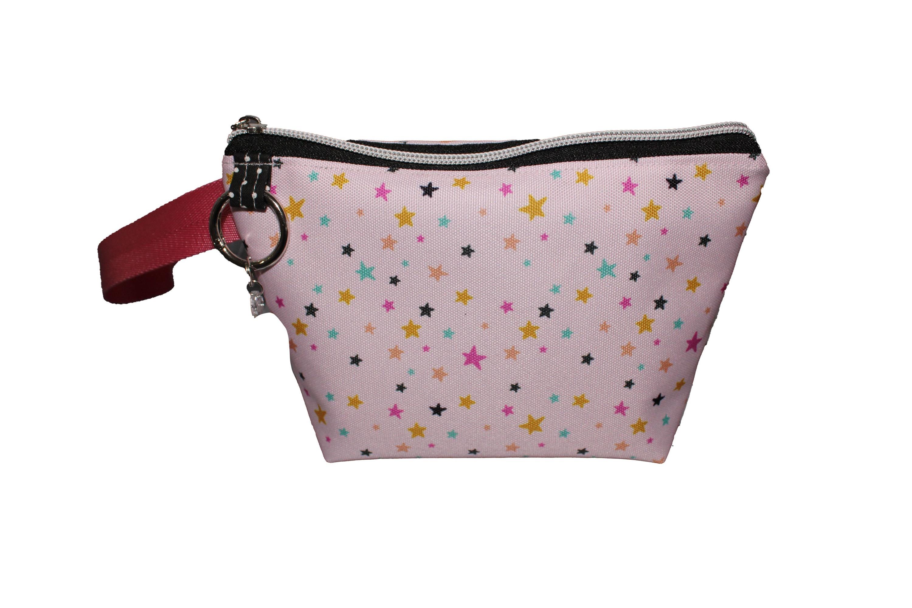 Featuring a striking Pink Star pattern design, this zippered pouch is perfect for keeping your must-have items stylishly organized. The sleek silver zipper keeps everything secure, while the attached wrist strap makes it easy to grab and go. A sturdy metal ring with a charming accent adds both function and flair — clip on your keys, charms, or use it as a statement detail.