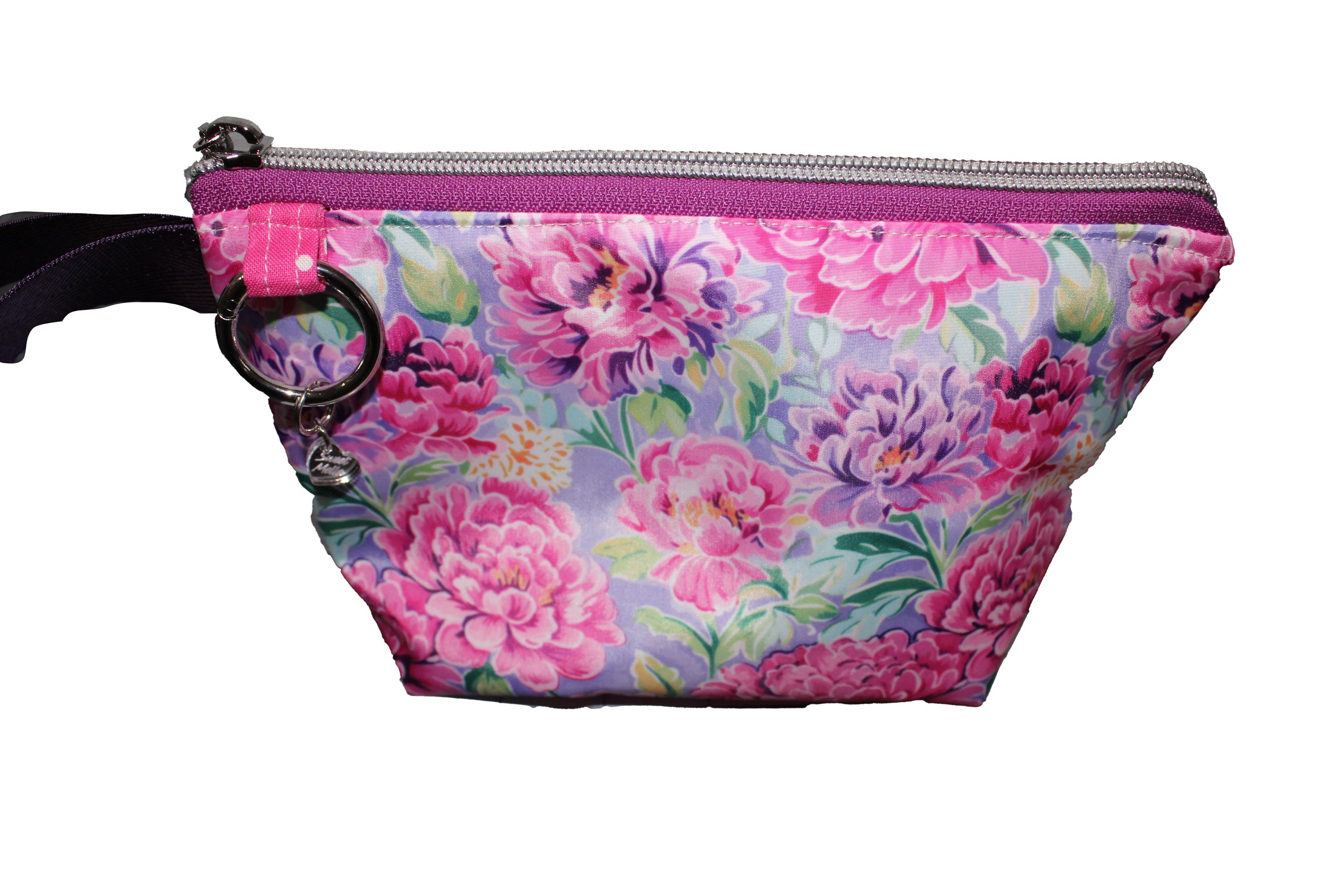 Featuring a striking floral pattern design, this zippered pouch is perfect for keeping your must-have items stylishly organized. The sleek silver zipper keeps everything secure, while the attached wrist strap makes it easy to grab and go. A sturdy metal ring with a charming accent adds both function and flair — clip on your keys, charms, or use it as a statement detail.