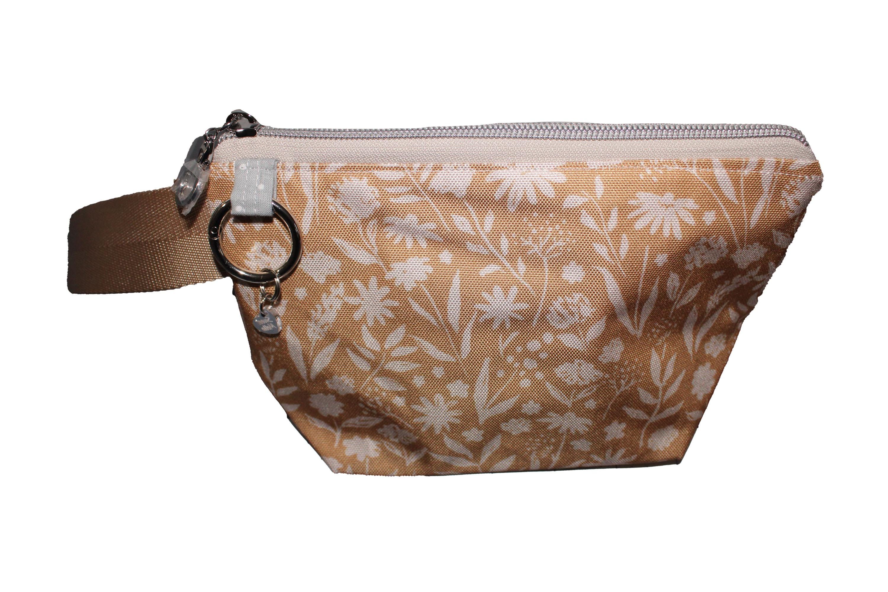 Featuring a striking floral pattern design, this zippered pouch is perfect for keeping your must-have items stylishly organized. The sleek silver zipper keeps everything secure, while the attached wrist strap makes it easy to grab and go. A sturdy metal ring with a charming accent adds both function and flair — clip on your keys, charms, or use it as a statement detail.