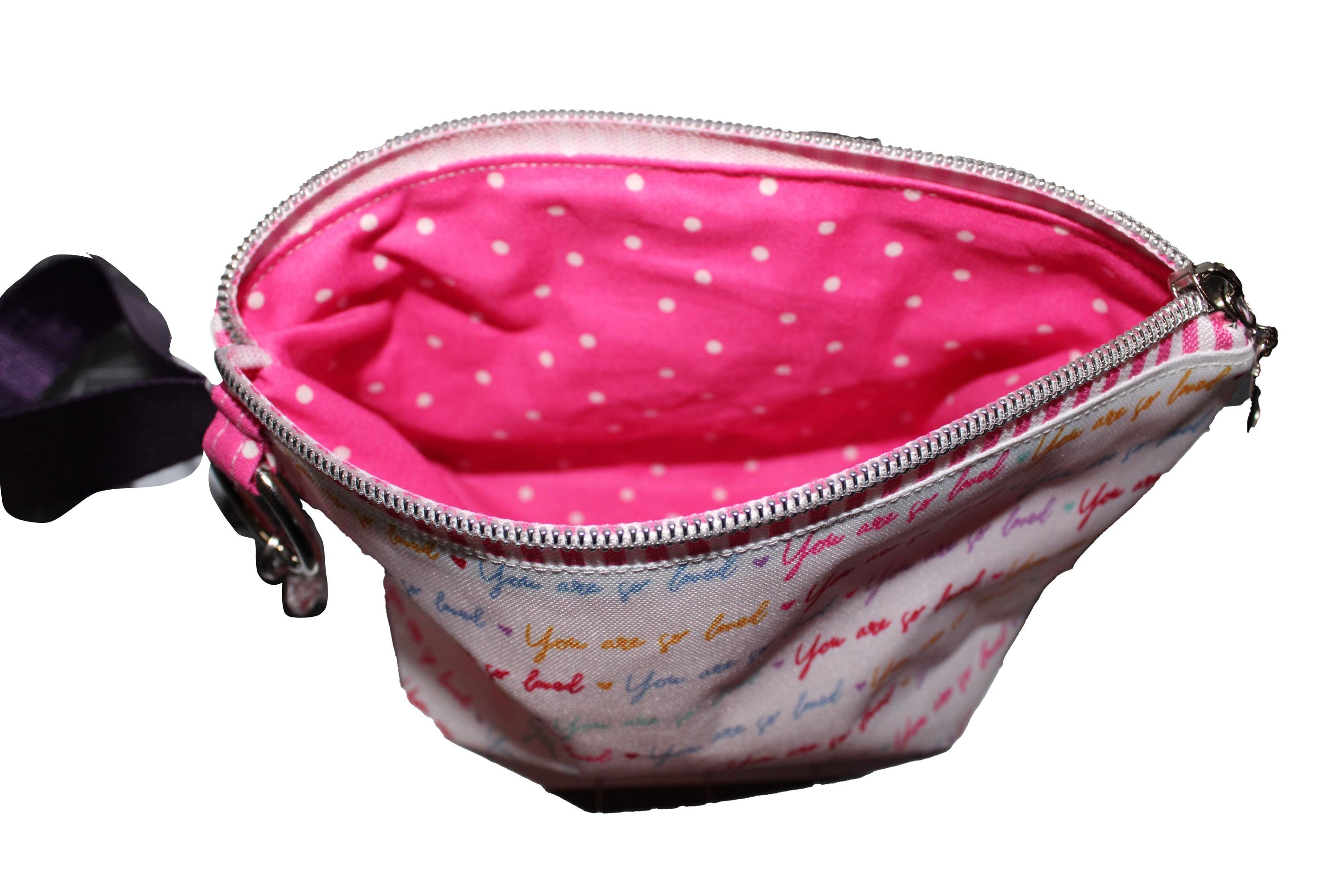Featuring a striking I Love You pattern design, this zippered pouch is perfect for keeping your must-have items stylishly organized. The sleek silver zipper keeps everything secure, while the attached wrist strap makes it easy to grab and go. A sturdy metal ring with a charming accent adds both function and flair — clip on your keys, charms, or use it as a statement detail.
