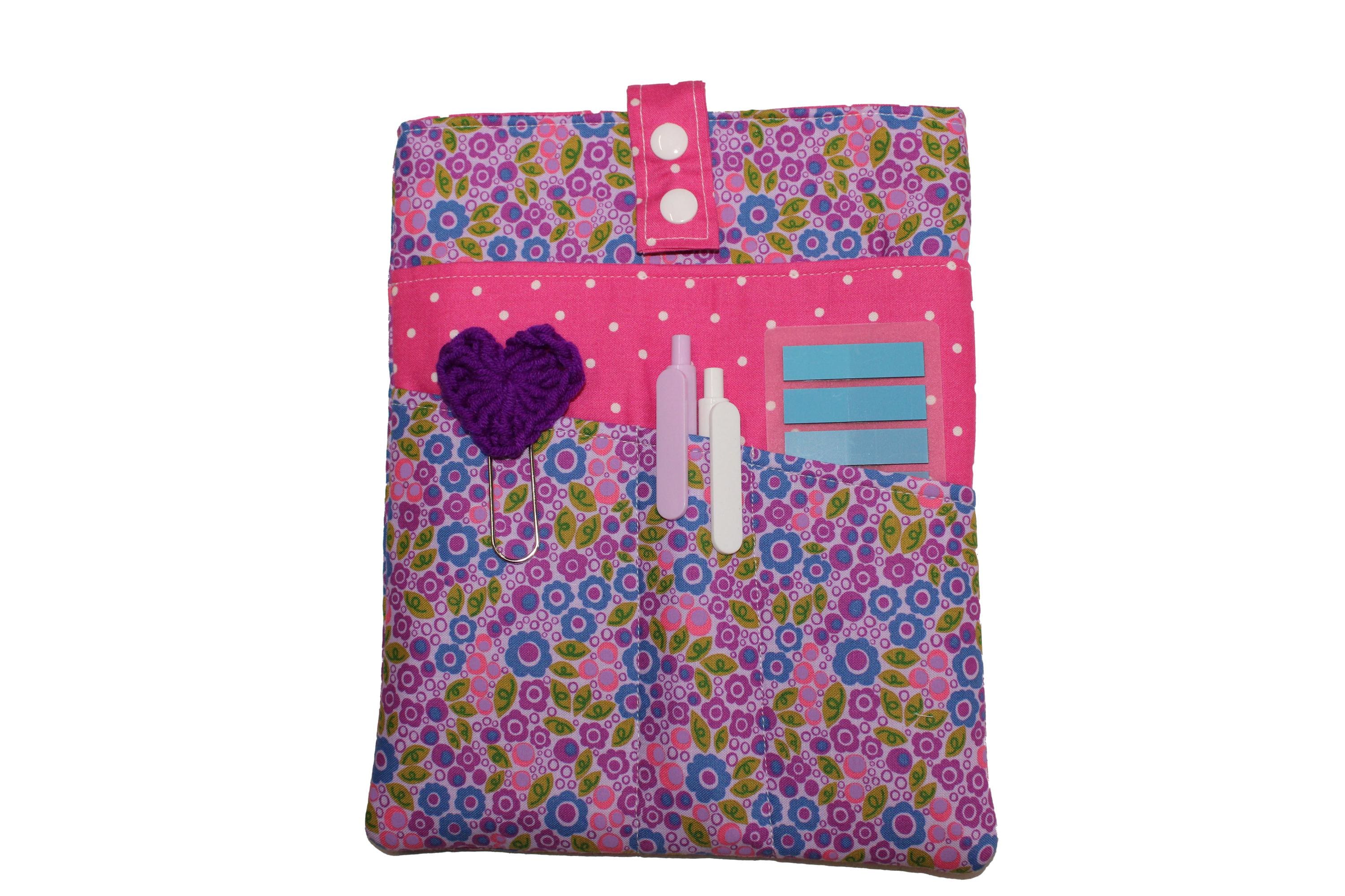 Made with several layers of padded quality cotton. Each Book Pocket Pal has one main large compartment with a snap closure, a middle compartment perfect for papers and smaller areas for pens and stickers.